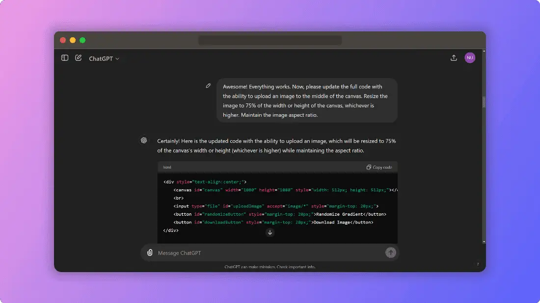 "Awesome, the tool is working great! Now please update the code to add the ability to upload a custom image that will appear on top of the gradient background."