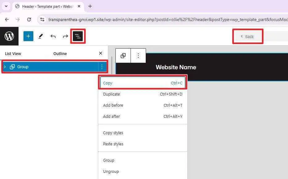 Still in the List View menu, right-click on the Group block that encapsulates the Header content, and then click Copy.