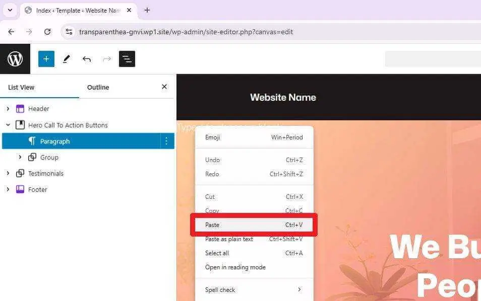 On the new block (Paragraph block) that we just added before, you can Paste the Header content onto it.