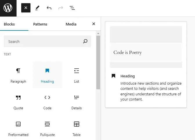 For those who prefer a more traditional approach, the block inserter sidebar is your friend. Click the ‘+’ icon in the top left corner to open it.